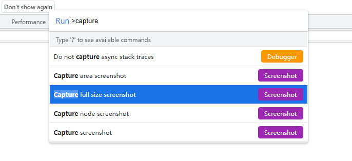Press F12 to enter the Console interface, then press Ctrl+Shift+P to bring up the Run panel, type Capture, and select Capture full size screenshot.
