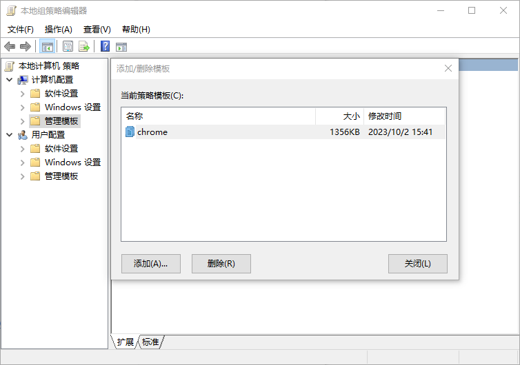 Select the policy_templates\windows\adm\zh-CN\chrome.adm file downloaded in the previous step to complete the import.