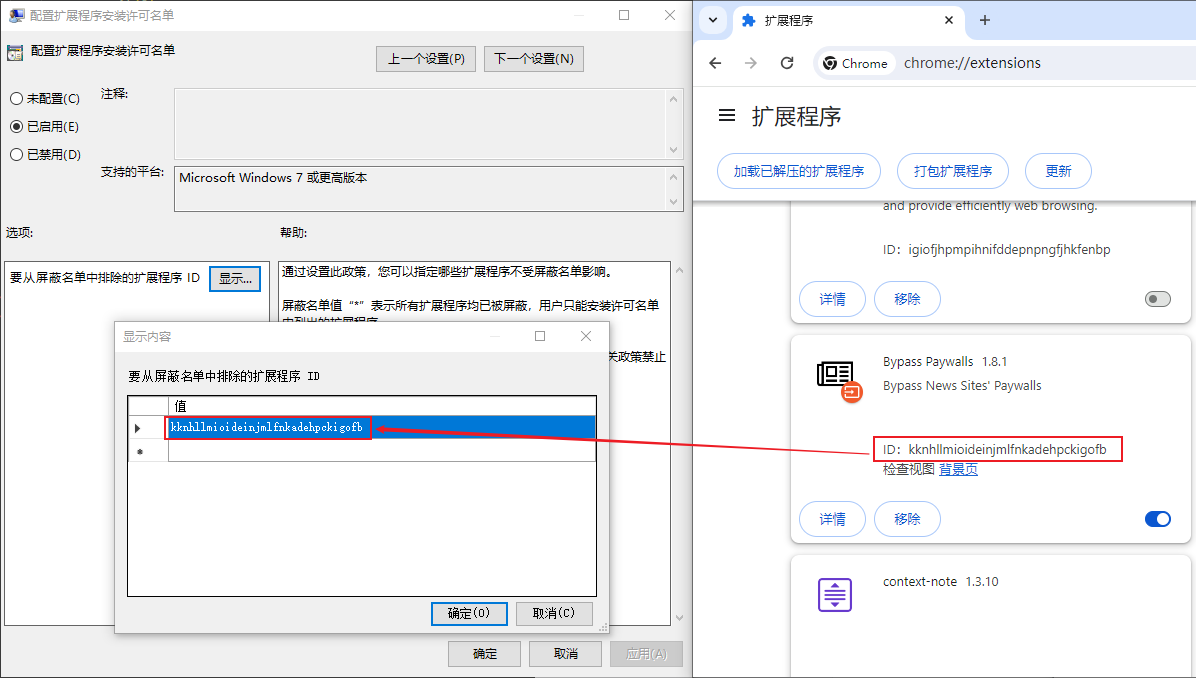 Enable and show Extension IDs excluded from blocking, and enter the ID of the CRX you want to install: