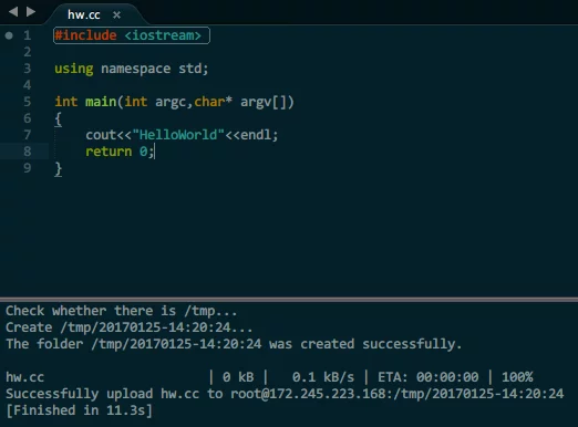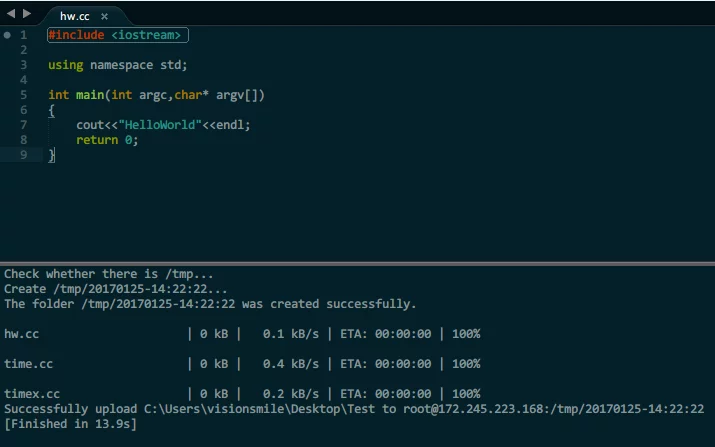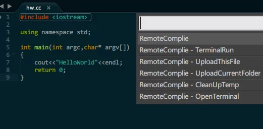 The code is hosted on GitHub: sublimeRemoteCompile, using some C++11 features, and the compiler must be specified during compilation.