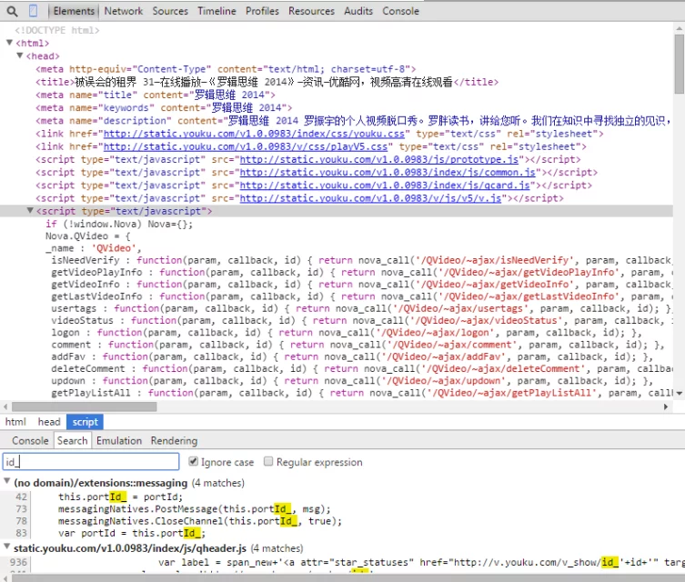 Clearly, XNzc5NjE2MzM is encoded using some method. One reason Youku encodes URLs and does not open RSS subscriptions is to make money from ads. However, this private encoding seems tricky, so I decided to check the page source: