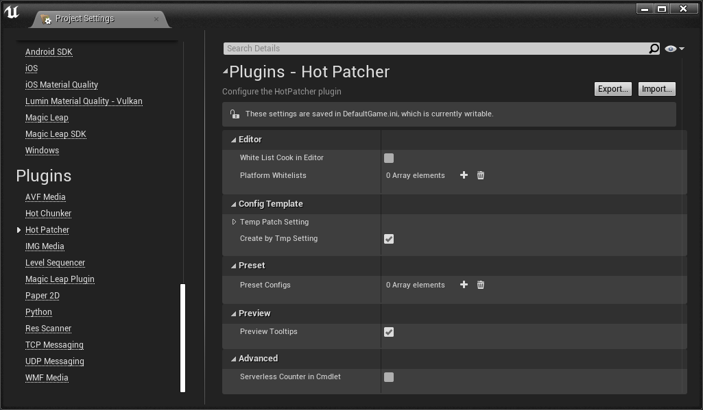 The logic here is to bind the CDO of the class UHotPatcherSettings to Project Settings - Plugins - Hot Patcher.
