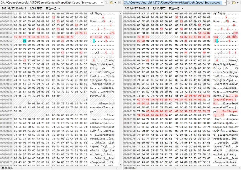 The comparison of the same resource before and after modification after cooking shows that the Cooked file only changed some data, while most of the data remained consistent. In this situation, updating the entire file seems wasteful, and the benefits of binary patches are significant.