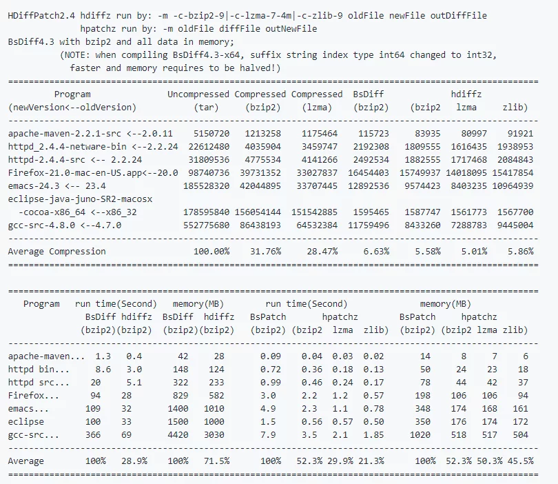 For binary DIFF/PATCH algorithms, I have currently chosen HDiffPatch, which has performance advantages over BsDiff: