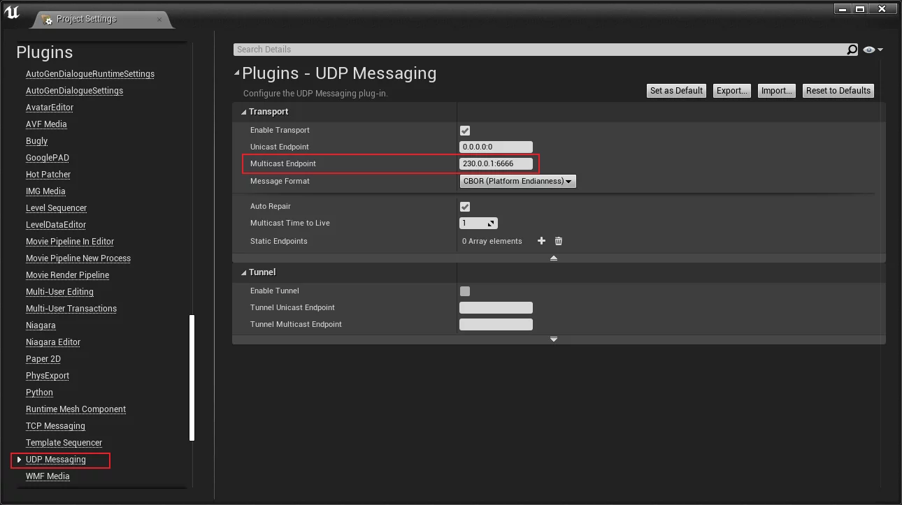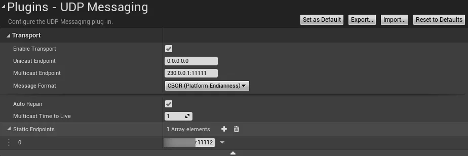Clients then need to set the server’s Static EndPoints in the UE editor under Project Settings-Plugins-UDP Messaging: