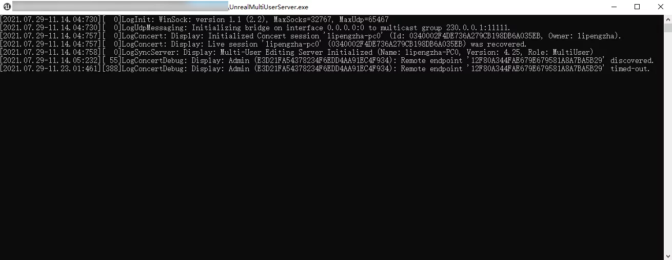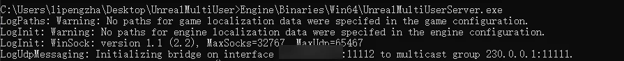 1 | C:\Users\lipengzha\Desktop\UnrealMultiUserServer\Engine\Binaries\Win64>UnrealMultiUserServer.exe |