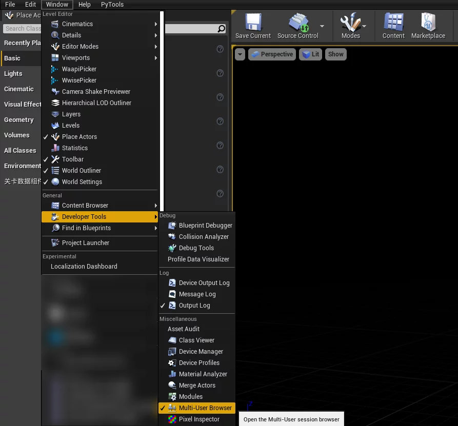 Once the plugin is enabled, you can see the Multi-User Browser option in the editor under Windows-Developer Tools (you can also enable Enable Multi-User Toolbar Button in Project Settings-Plugins-Multi-User Editing):