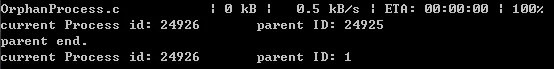 Running the above code shows that when the parent process ends before the child process, the child process’s parent ID changes to init (1) (adopted by init);