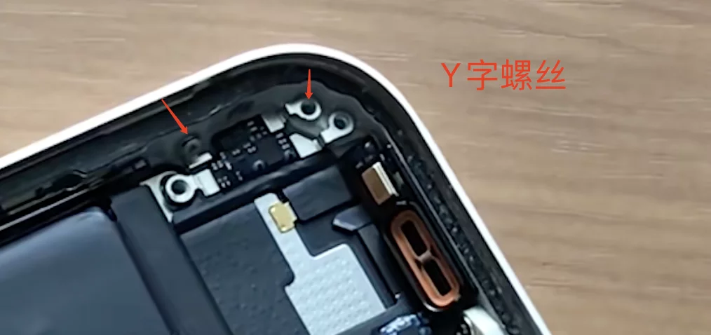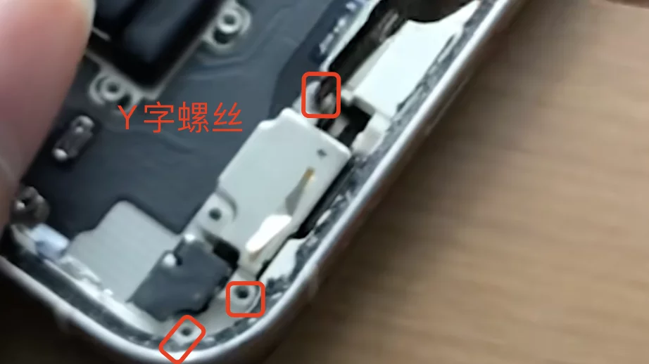 Unscrew the 2 cross screws and 3 Y screws on the left side of the original vibration motor location to remove the left microphone fixation plate.