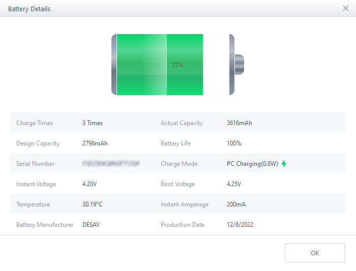 The original iPhone 12 has a battery capacity of 2815mAh, while the old battery’s health dropped to 77%, it would basically die in half a day. After replacing it, the capacity is now 3320mAh, which is 505mAh more than the original, and the new battery’s health is better, leading to improved endurance:
