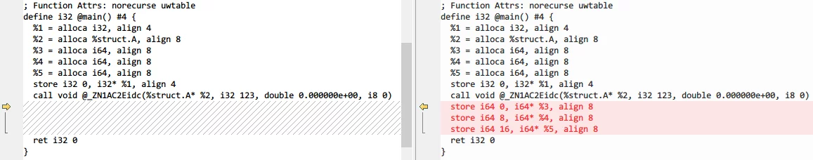 By comparing with diff, we can observe the difference in the LLVM-IR code for both: