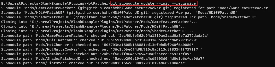 For initial downloading of public modules, execute the following command in the root directory of the HotPatcher plugin: