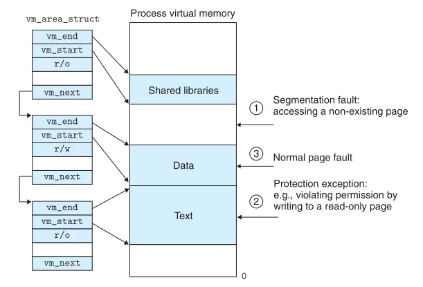 Does the virtual address fall within the defined range of a specific area structure? The page fault handler will search through the linked list of area structures, comparing the virtual address with vm_start and vm_end in each area structure. If the instruction is not valid, the page fault handler will trigger a segmentation fault, thereby terminating the process.
