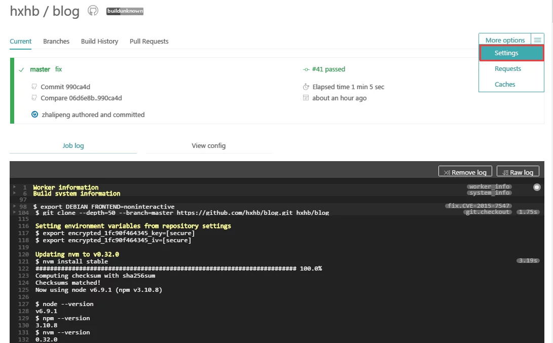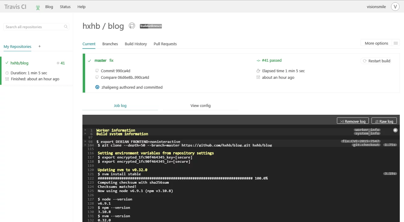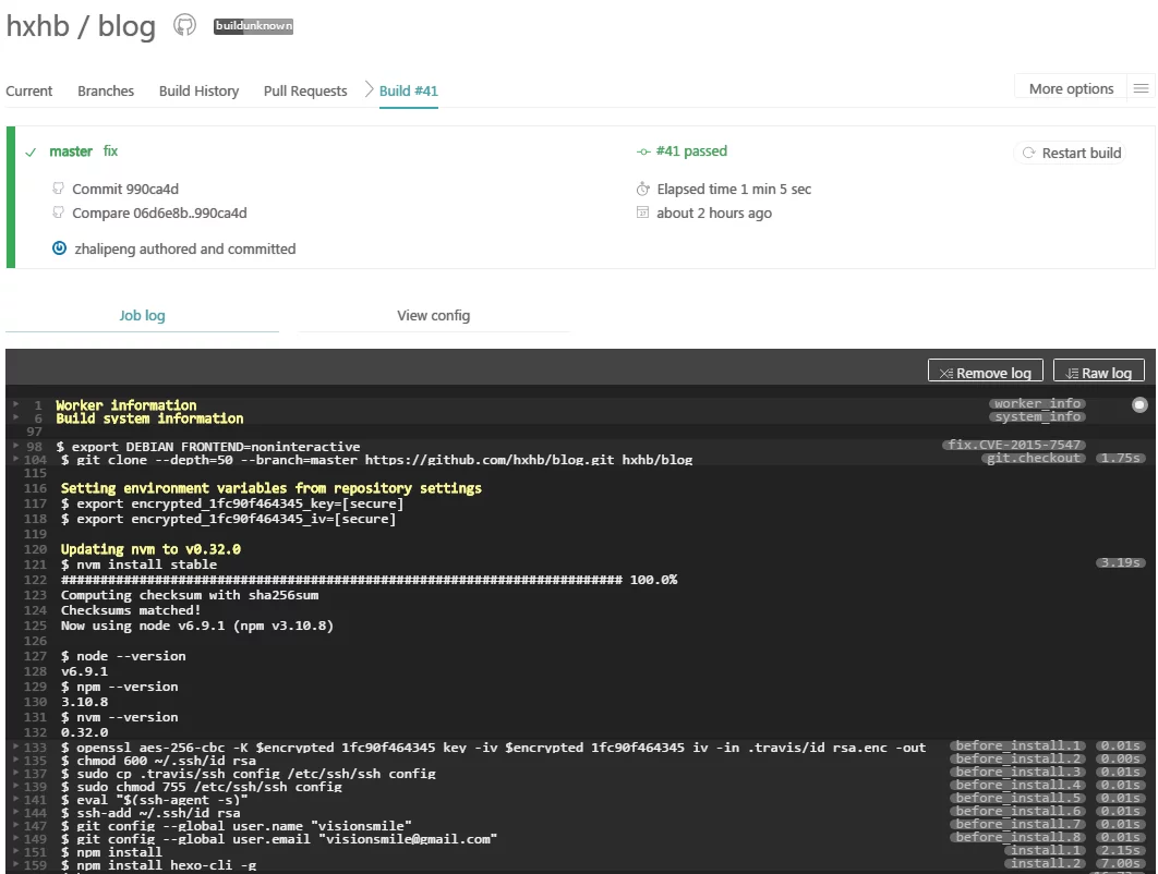 Now, updating the blog articles only requires pushing .md articles to the blog source repository (branch), and Travis CI will detect the update and Continuous Integration will automatically deploy the updates to our blog.