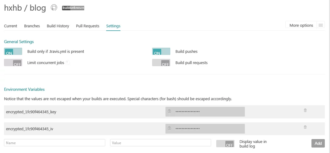 At this point, you will see two environment variables created in the settings of the imzlp/blog-source repository in travis-ci: $encrypted_1fc90f464345_key and $encrypted_1fc90f464345_iv. The contents defined by these two environment variables are not visible to others, ensuring the safety of our private key, which will be used to decrypt it.